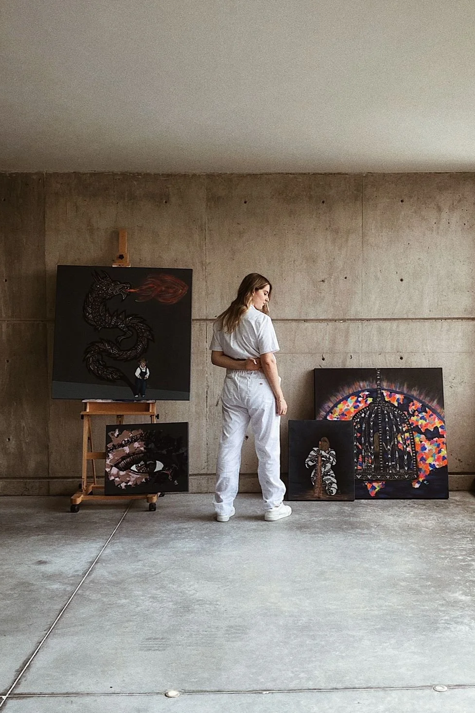 Esta es una de mis pinturas favoritas. Soy yo de niña, y la sombra es un dragón por muchas razones: Primero, es mi signo zodiacal chino; nací en 1988, número que escondí en el dragón en números romanos "MCMLXXXVIII". En segundo lugar, el dragón representa poder, fuerza y fiereza, que es exactamente como me siento después de que terminó este gran episodio.